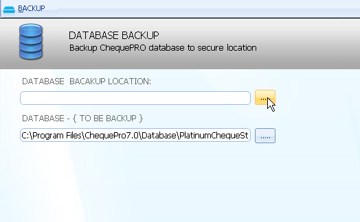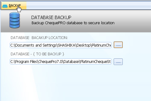 2. A window will be prompted to select the 'DATA BASE BACKUP LOCATION'. (The location which needs to save the Backup) and 'DATABASE - {TO BE BACKUP} (The location of the current Database located)