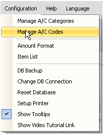 1. To add new A/C Code , Select 'Configuration' menu and click on 'Manage A/C Codes' submenu