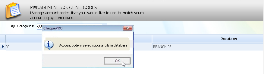 6. Click on 'Ok' for the Confirmation Message as Account Code is saved successfully in database.'
